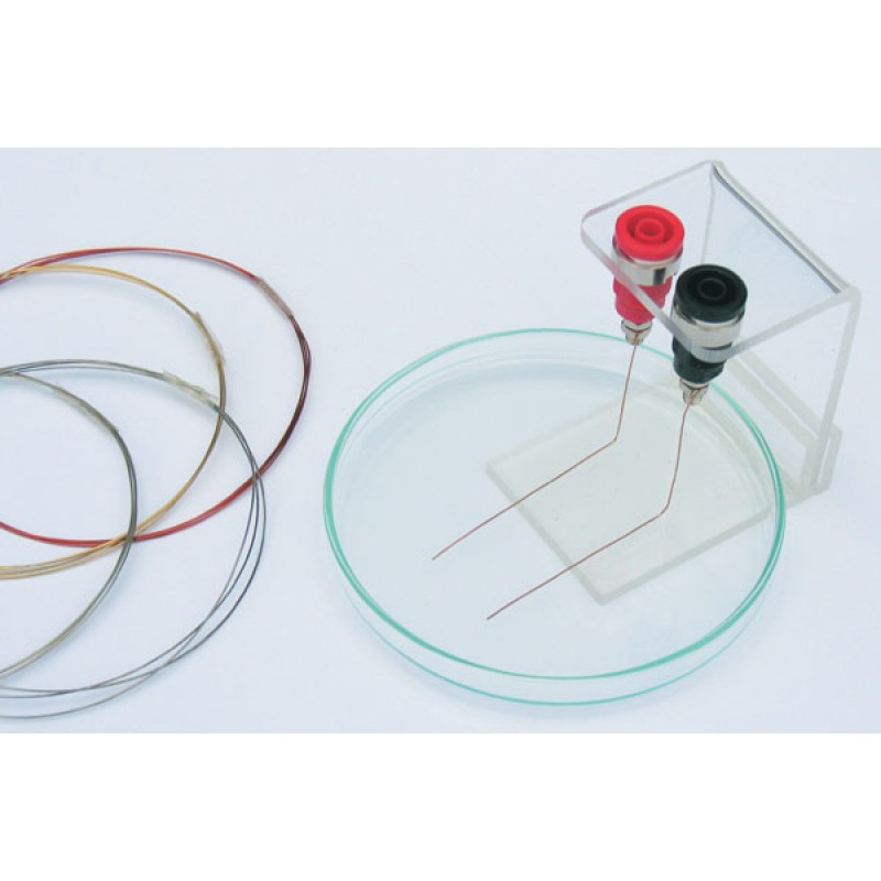 Les électrodes fines de 0,2 mm de Ø seront utilisées facilement avec ce système pour montrer la décomposition d’une électrode métallique à l’ anode et un dépôt à la cathode.