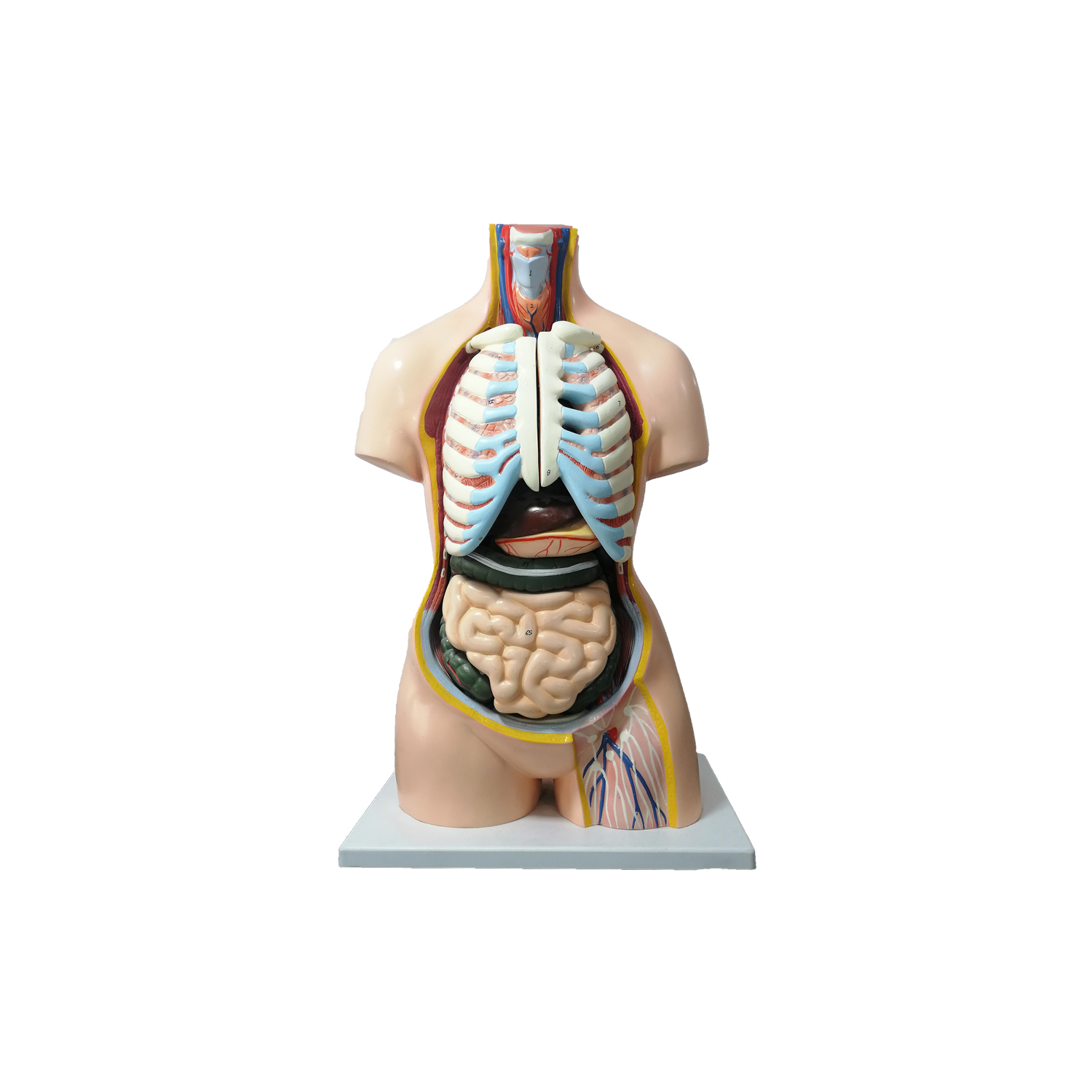 La cuisse gauche a une partie découpée pour révéler la vascularisation lymphatique et sanguine trouvée à cet endroit également. Contient 2 poumons, cœur, foie, estomac, intestins et haut de la vessie