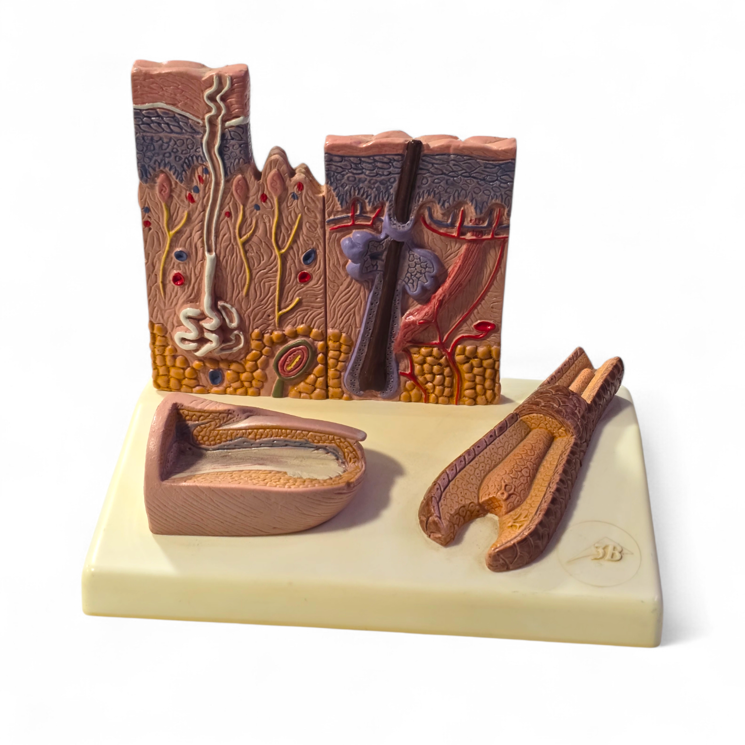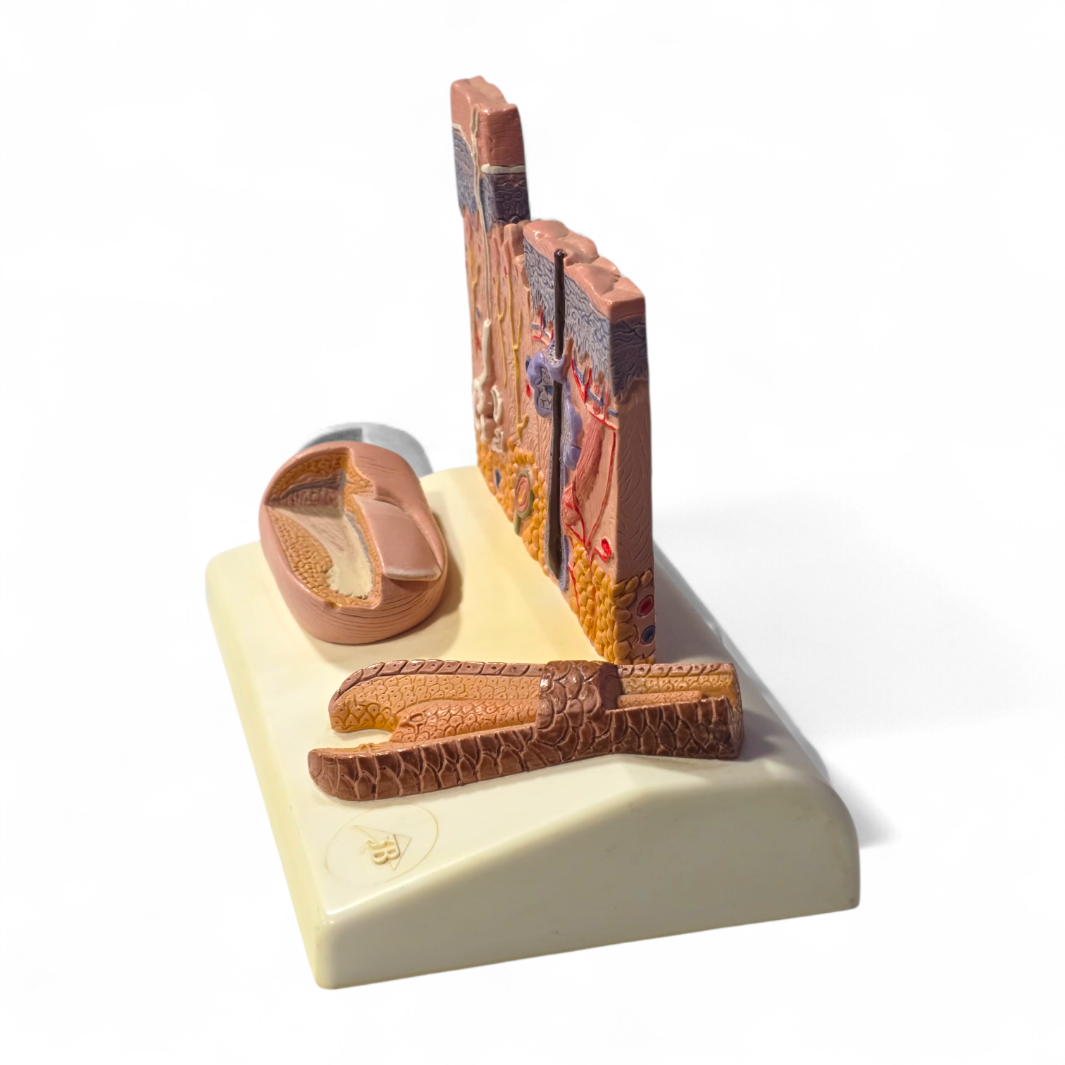 Ce modèle anatomique illustre en détail la structure microscopique de la peau humaine, y compris les cheveux et les ongles. Il est conçu pour l’enseignement, la formation et la démonstration en classe, en cabinet médical ou lors d’études en dermatologie et anatomie.