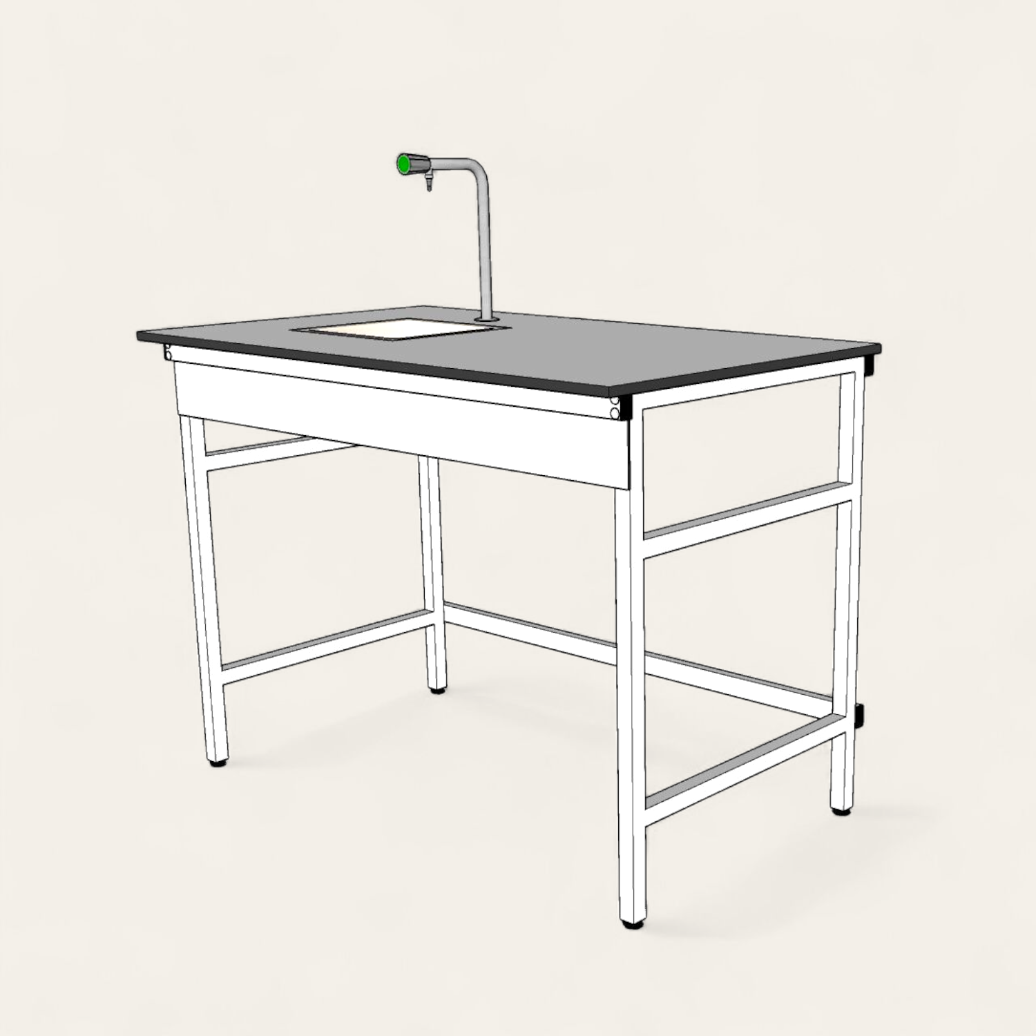 Chassie modulaire robuste en tube d’acier de 30*30 mm, piétement à vérin de mise à niveau, peinture époxy RAL Blanc, plan de travail en HPL 16  mm Garantie 10ans ,anti acide ,anti rayure , anti bacterien, anti statique, avec Evier en Polypropylène anti acide Garantie 2 ans 300*300 mm et Robinet de Laboratoire Garantie 10ans simple sans mélangeur.