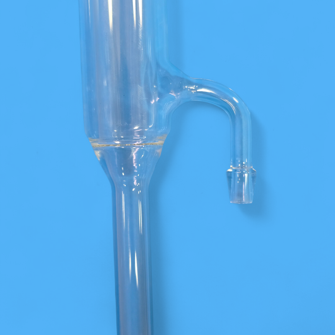 Ce réfrigérant droit type Liebig possède également un tube intérieur rectiligne, mais ses embouts d’entrée et de sortie d’eau sont placés sur des côtés opposés (un en haut, un en bas).