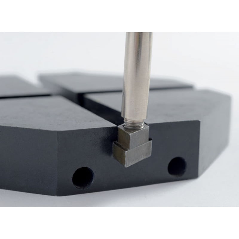 Deux rainures en T perpendiculaires permettent la mise en place rapide des tiges auto-serrantes dans différentes positions : centrée, excentrée ou en multi-axes.